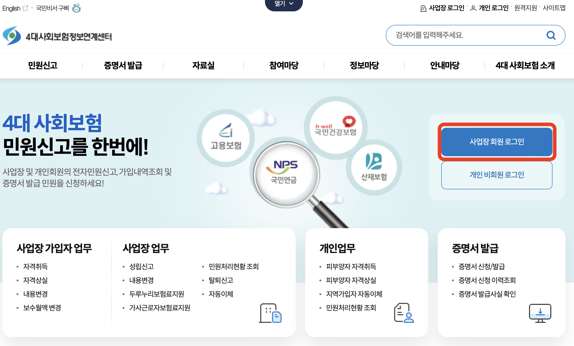 1. 4대보험 정보연계센터 사이트로 접속하셔서 개인/사업장 공인인증서 로그인 하세요.