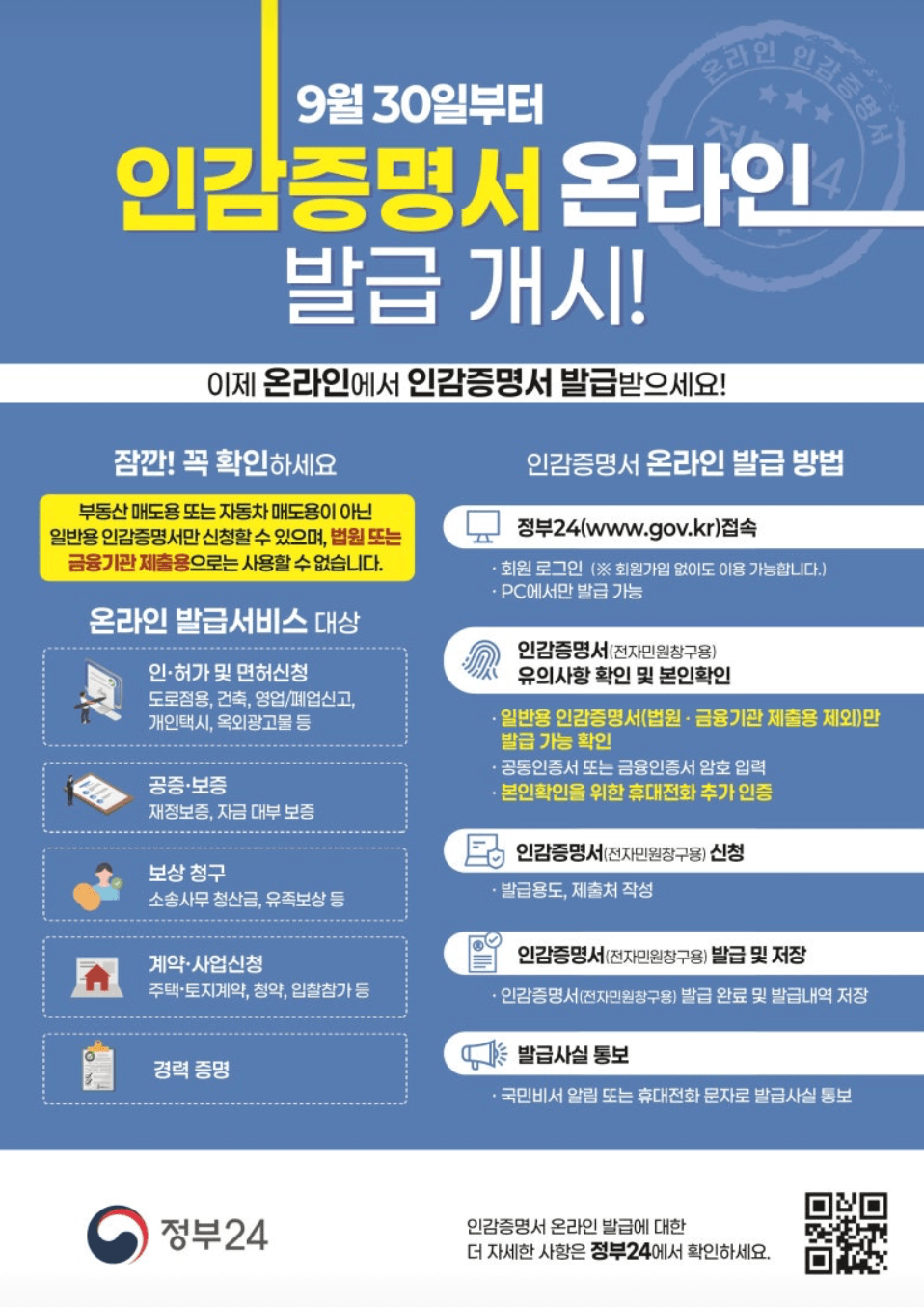 온라인에서는 발급받을 수 있는 인감증명서는 용도가 제한되어 있다는점을 꼭 참고하시기 바랍니다. 일반용 인감증명서 중에서도 법원이나 금융기관에 제출하는 용도가 아닌 인감증명서만 온라인 발급이 가능합니다.