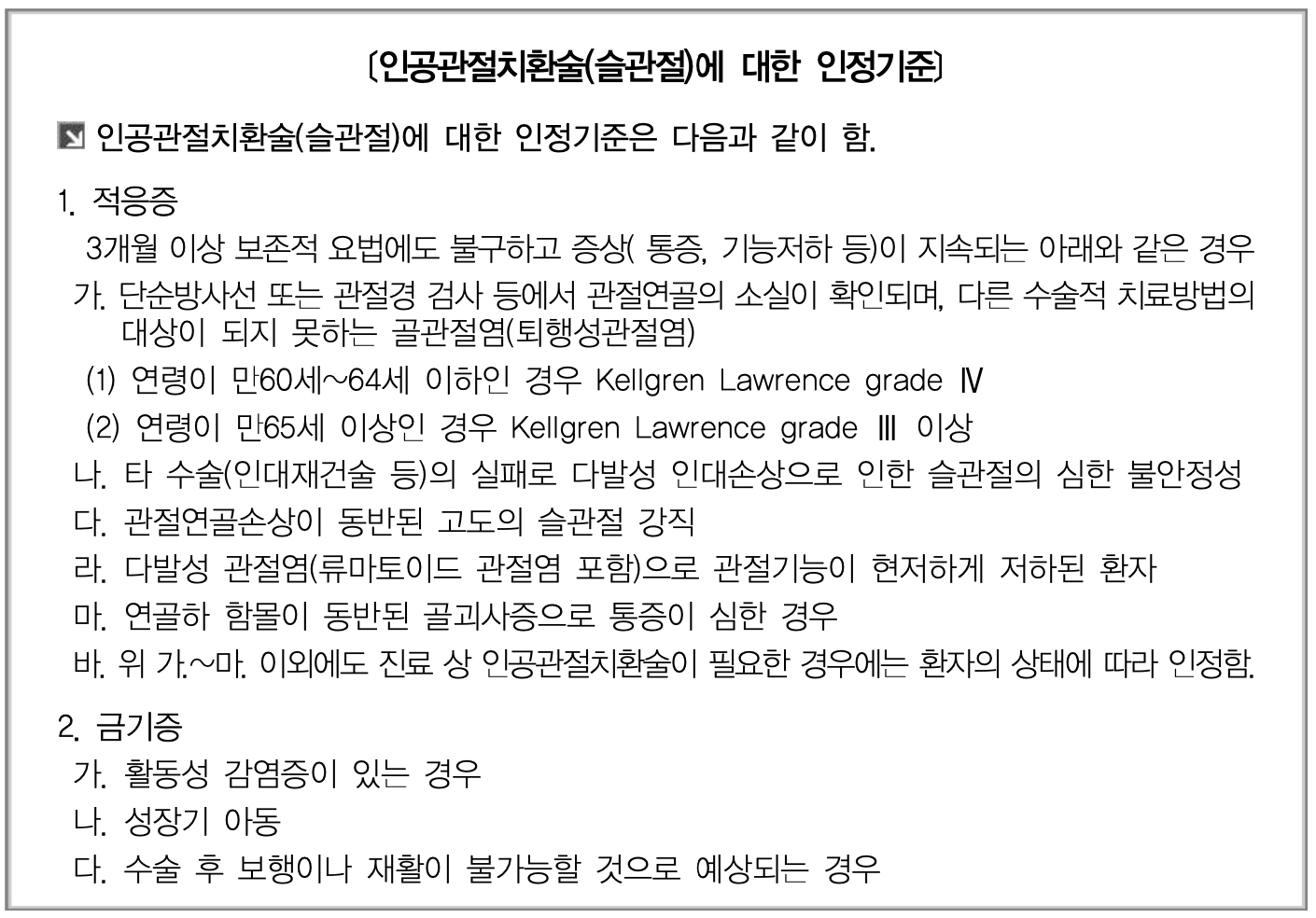 - 대상질환 : 건강보험급여 '인공관절치환술(슬관절)인정기준에 준하는 자