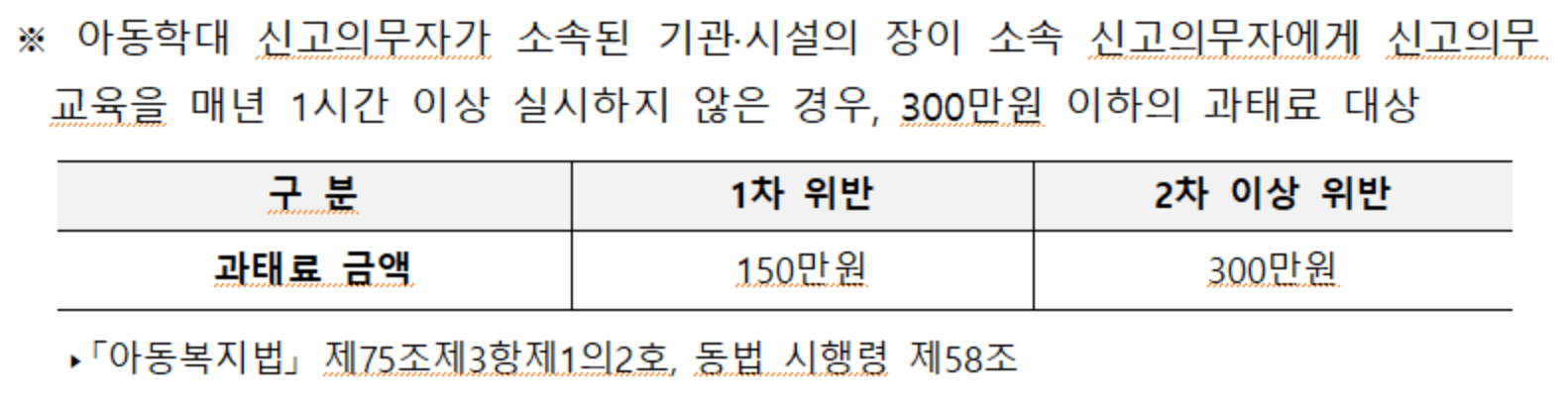 아동학대 신고의무자가 소속도니 기관에서 신고의무자에게 신고의무교육을 매년1시간 이상 미실시한 경우, 1차 위반은 150만원 2차이상 위반시 300만원의 과태료가 부과 될 수 있어요.