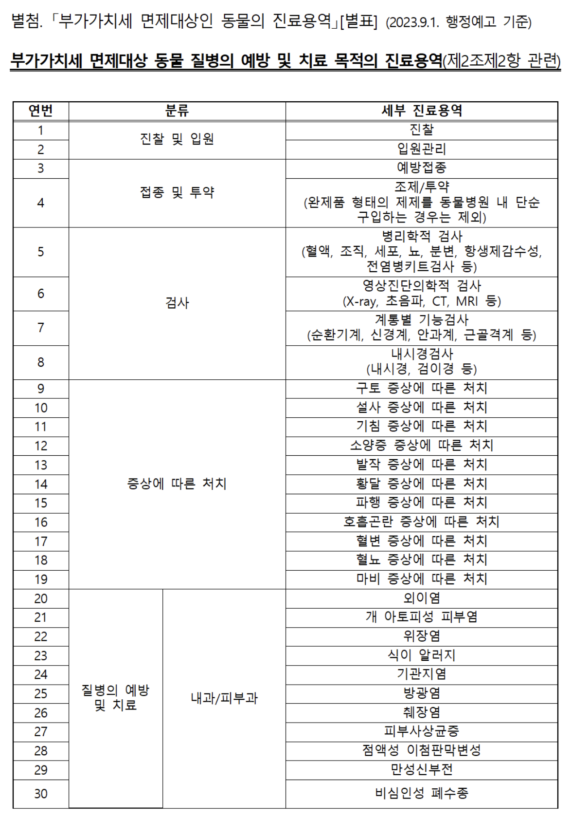 오는 23년 10월 1일부터 반려동물 양육가구의 동물 진료비 부담 완화를 위한 이번 고시 개정에 따라 그간 질병 예방 목적의 일부 진료항목*에 대해서만 부가세가 면제되던 것 앞으로는 치료 목적의 진료항목까지 포함하여 면제 대상이 대폭 확대됩니다 따라서 반려동물의 진료항목 100여개에 대해 진료비 부가세가 면제됩니다.