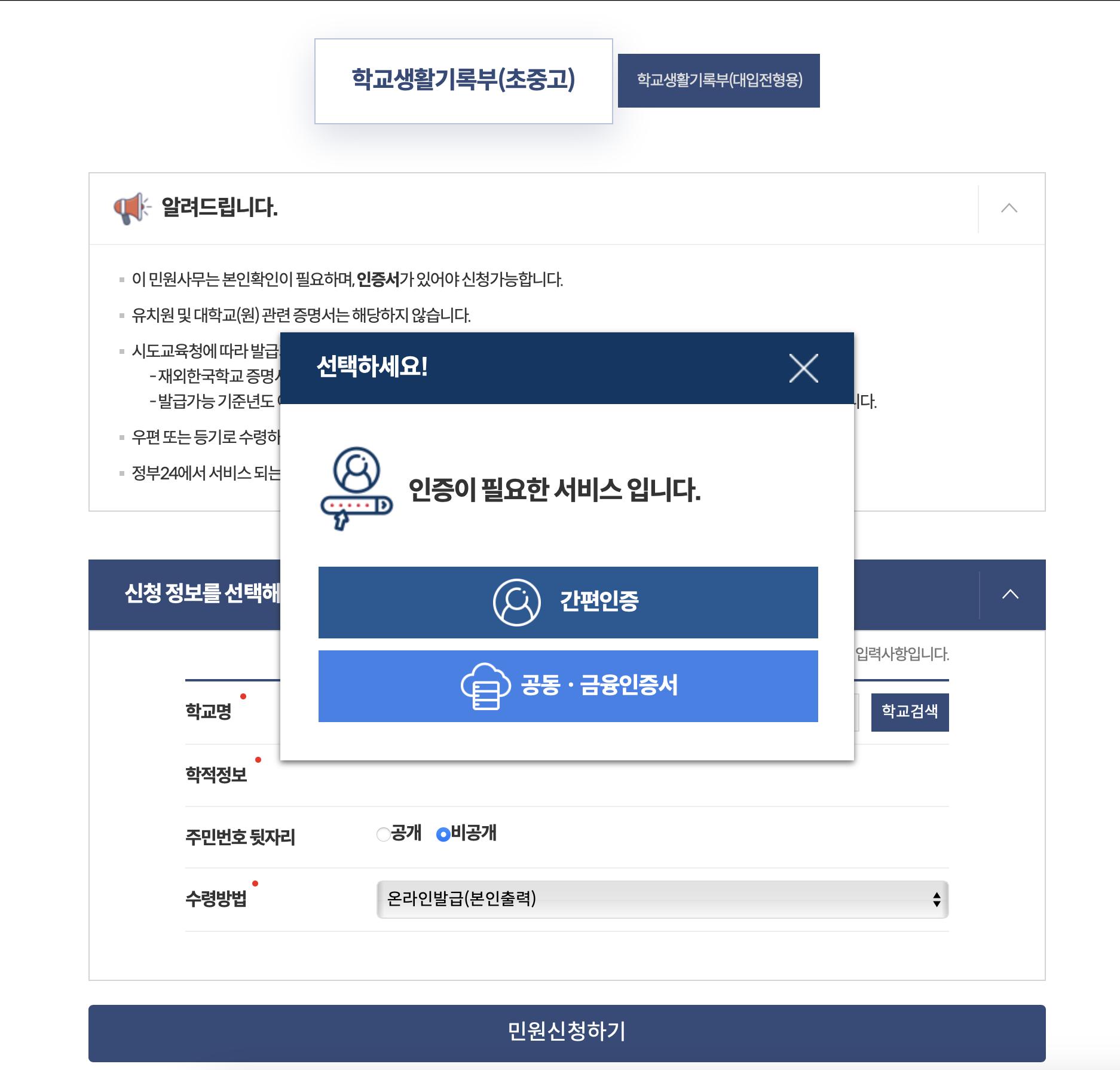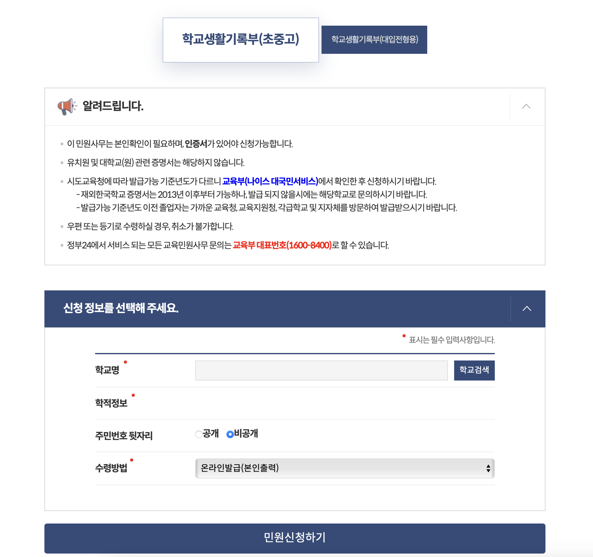 7. 검색하여 본인의 정보를 확인하고 민원신청하기를 누르면 완료. 수령방법에 온라인발급(본인출력)을 선택하시면 바로 프린트 및 pdf파일로 저장이 가능합니다. 우편으로 받고싶은경우 일반우편, 등기보통우편을 선택하시면 우편으로 받아보실 수도 있으나 수일이 걸릴 수 있습니다.