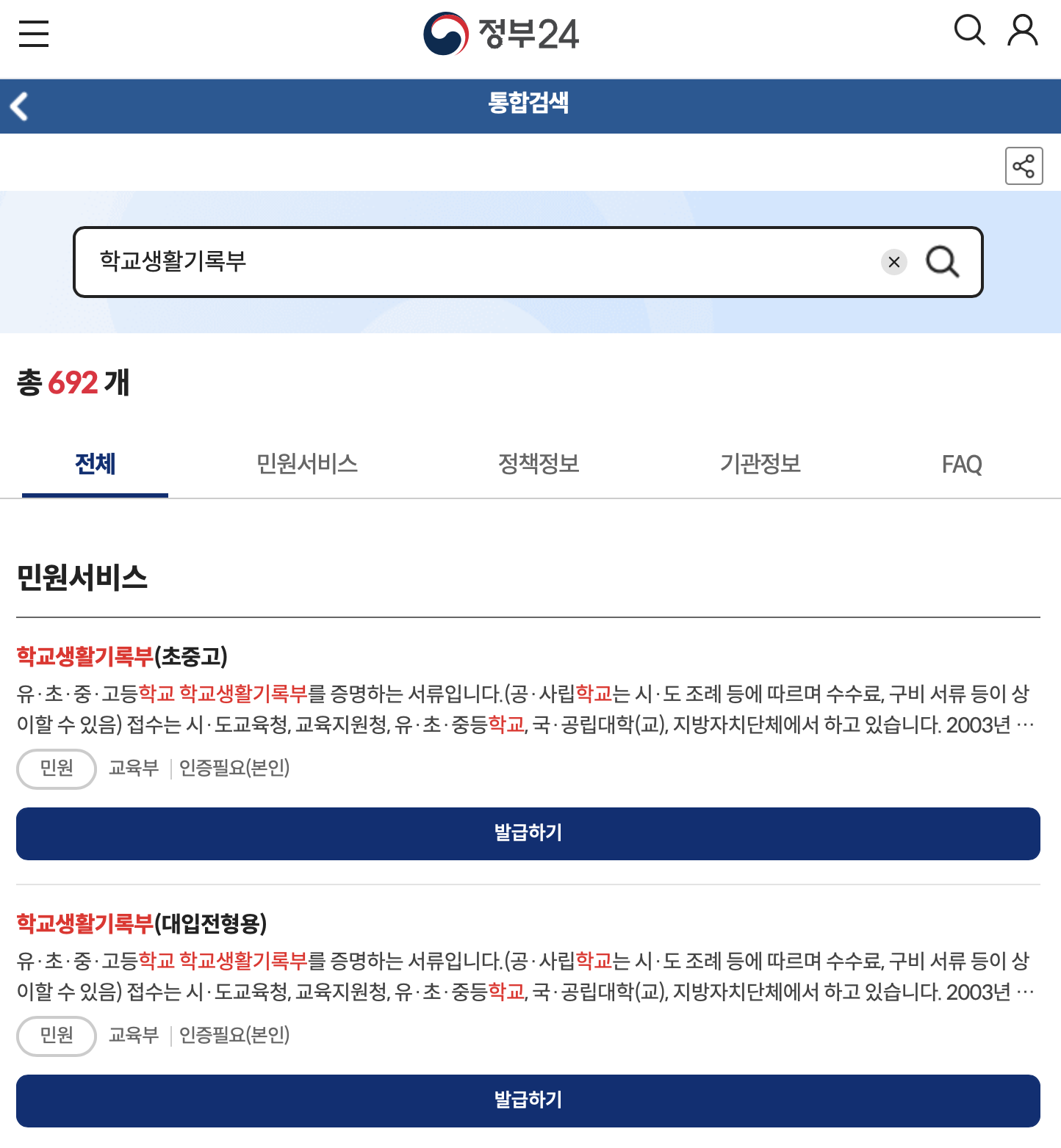 1. 위링크 정부24에 접속하면 뜨는 아래화면에서 초중고 또는 대입전형용 필요한 항목에 발급하기를 선택합니다.
