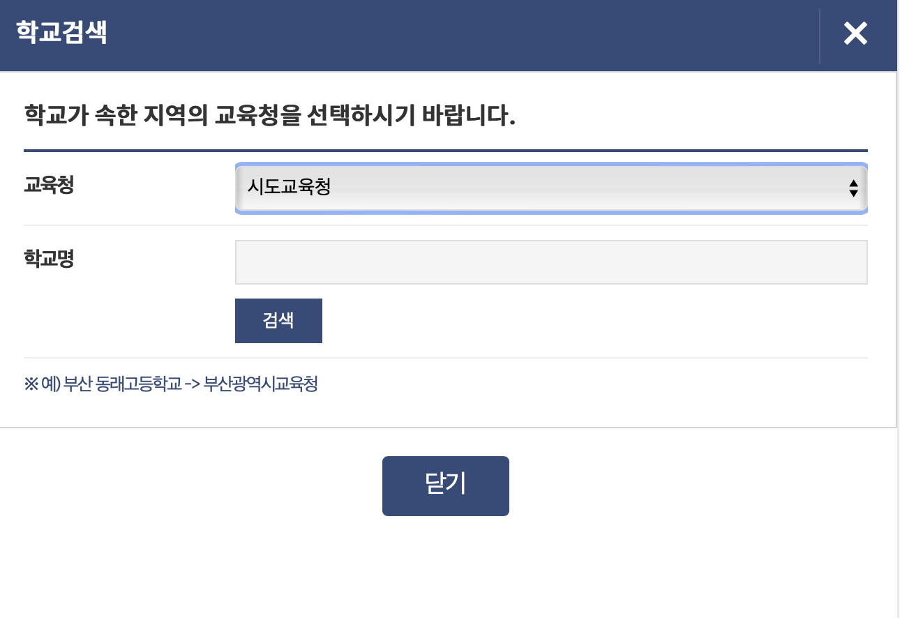 6. 인증 후 재학했던 학교의 교육청을 선택하고 학교명을 기재해서 검색해주세요.
