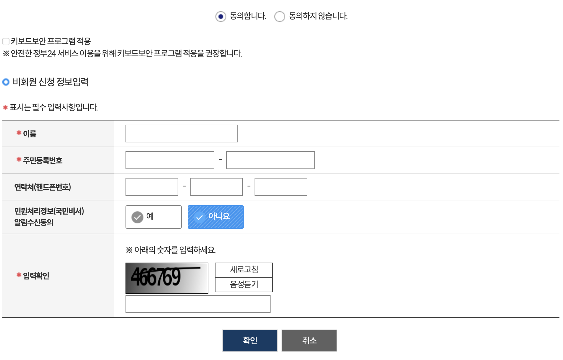 3. 비회원으로 발급시 개인정보 사항에 동의해주세요, 아래내용을 기재해주세요