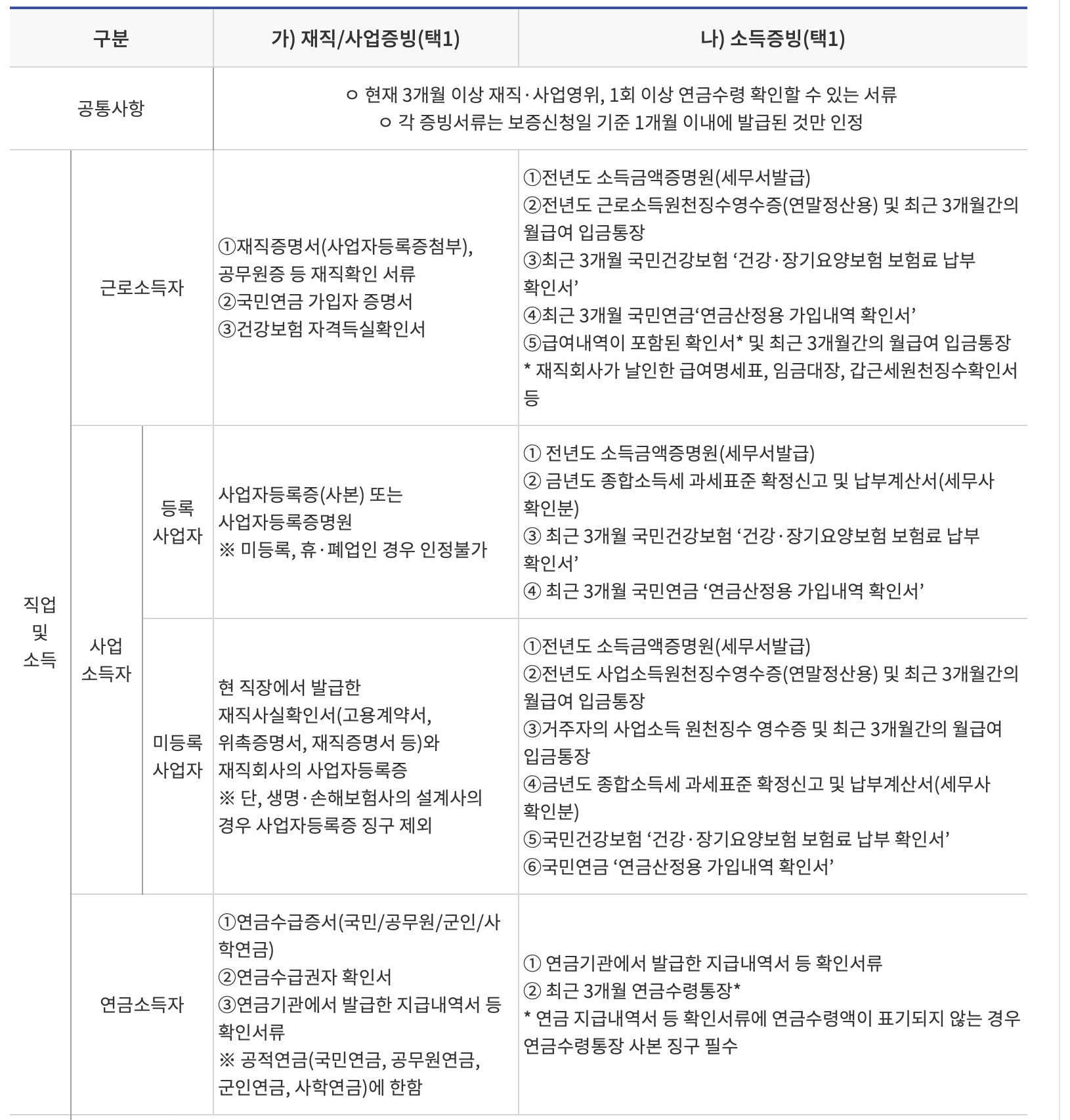 현재 3개월 이상 재직·사업영위(또는 1회 이상 연금수령) 확인을 위해 재직·사업증빙 및 소득증빙 서류 제출이 필요합니다.※ 주민등록증 등 실명확인증표는 공통적으로 필요합니다.