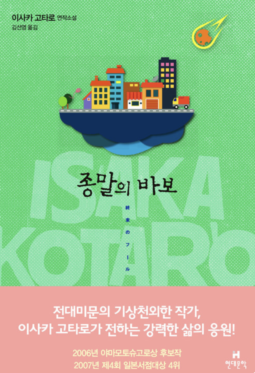 이사카 고타로의 종말의 바보 원작에서는 소행성 충돌까지 8년의 시간이 예고되었고 5년쯤 지나 남은 3년의 시간을 다루고 있습니다. 때문에 소설에서는 소행성충돌의 충격이 좀 사그라들어 소강상태가 된 시점이기 때문에 드라마보다는 혼란이 좀 줄어든 시기입니다. 이미 종말을 받아들인 사람들은 그저 일상의 삶을 살아가고 이런 이야기들을 옴니버스 형식으로 풀어갑니다. 드라마보다 각자 소소한 삶의 이야기를 중점적으로 다루는데 드라마는 남은시간을 200일정도로 설정하여 좀더 혼란스러운 상황을 배경으로 하며, 소설에 등장하지 않는 인물들을 중심으로 이야기가 흘러가기 때문에 소설과는 많이 다른방향으로 진행되는것으로 보입니다.